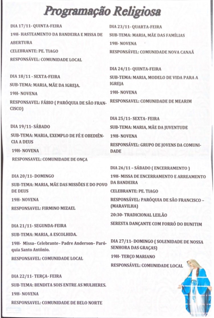 Pertencente a Paróquia de São Francisco de Assis, do Bairro Maravilha, a festa deste ano tem como tema “A exemplo de Nossa Senhora das Graças, sejamos missionários do reino de Deus”.