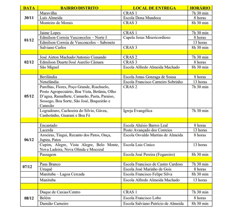 A distribuição iniciará nesta quarta-feira, 30, e deve seguir até a quinta-feira, 08 de dezembro.