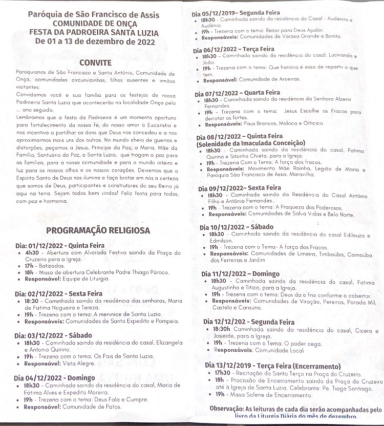 A Comunidade Católica de Onça, na zona rural de Quixeramobim, realiza a partir de hoje, 1º de dezembro, as festividades da padroeira Santa Luzia. Pertencente a Paróquia de São Francisco de Assis, a festa tem como tema este ano “Com Santa Luzia uma Igreja em missão”.