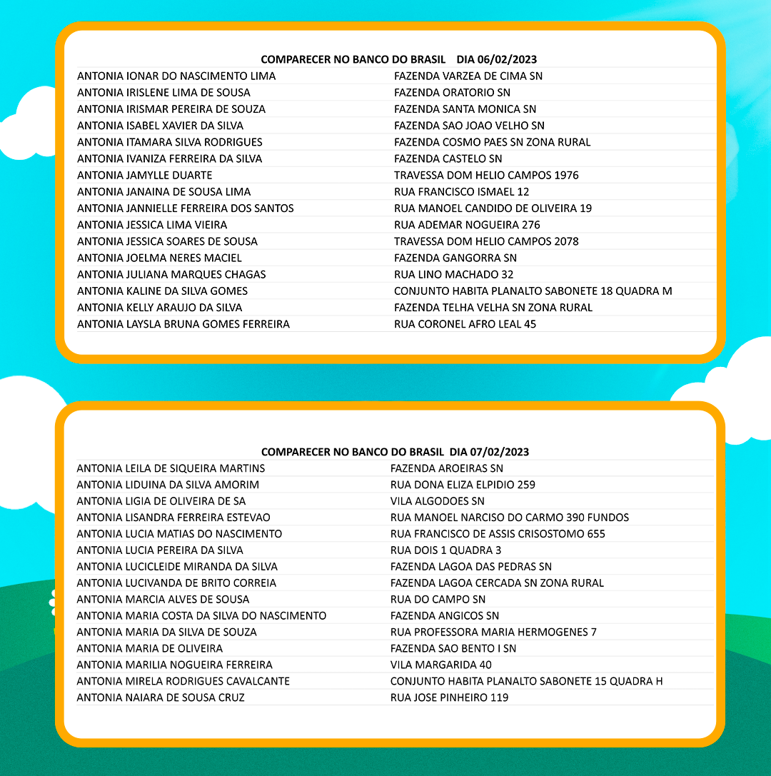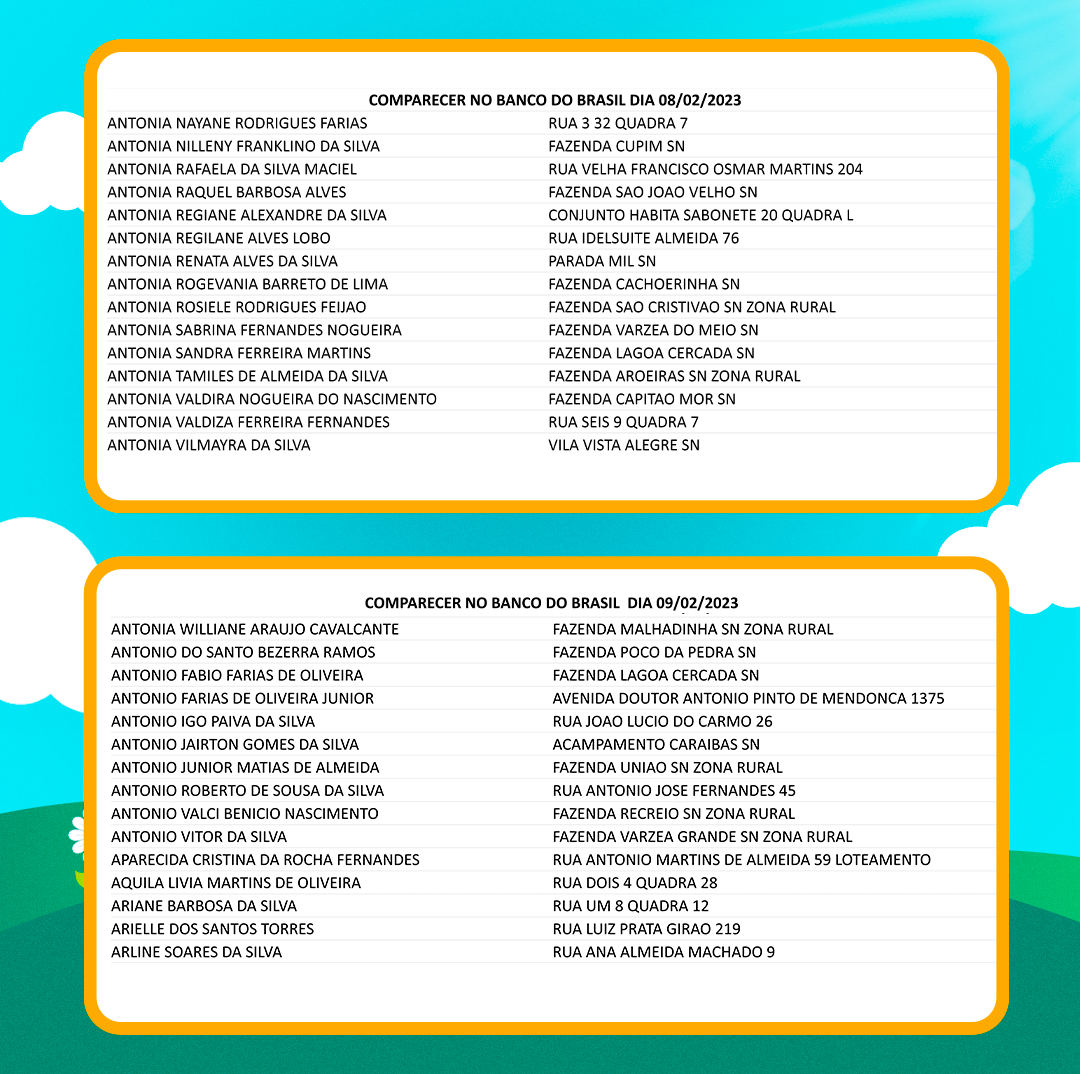 Os nomes divulgados nessa nova remessa deverão comparecer a partir desta segunda-feira, 06, na agência do Banco do Brasil de Quixeramobim, portando RG, CPF e comprovante de residência. A entrega deve se estender até quinta-feira, 09 de fevereiro.