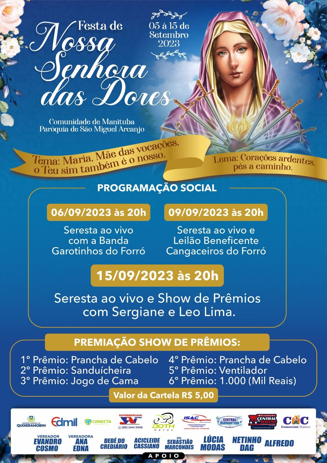 A tradicional Festa de Nossa Senhora das Dores do Distrito de Manituba terá início nesta terça-feira, 5, e se estenderá ate dia 15 de setembro.