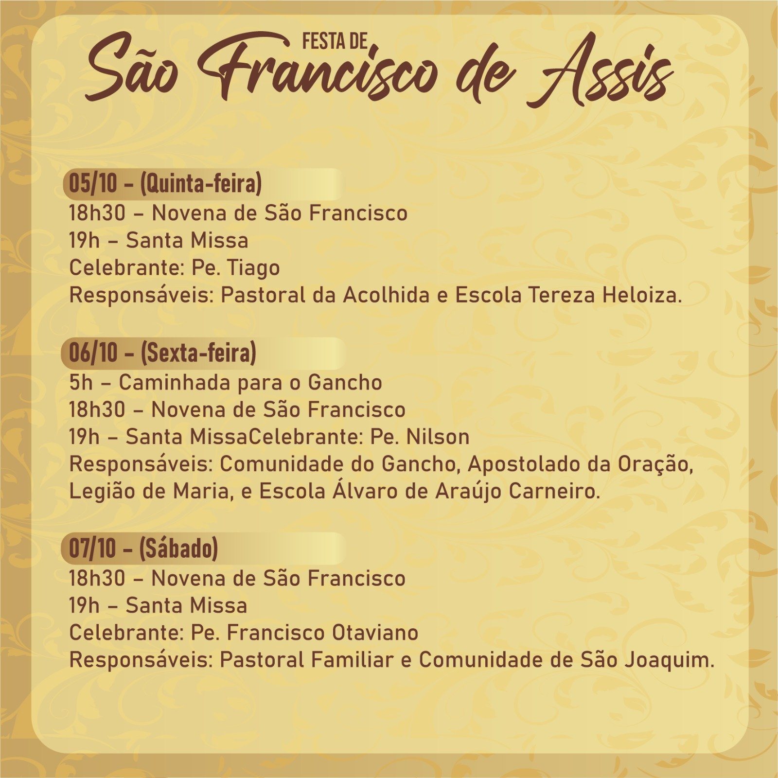 A programação festiva na Paróquia segue até o dia 12 de outubro, ocasião em que será realizada a Procissão de São Francisco, às 17h30. Às 19h, acontecerá a Santa Missa de encerramento que será celebrada pelo bispo da Diocese de Quixadá, Dom Aurélio Pinto.