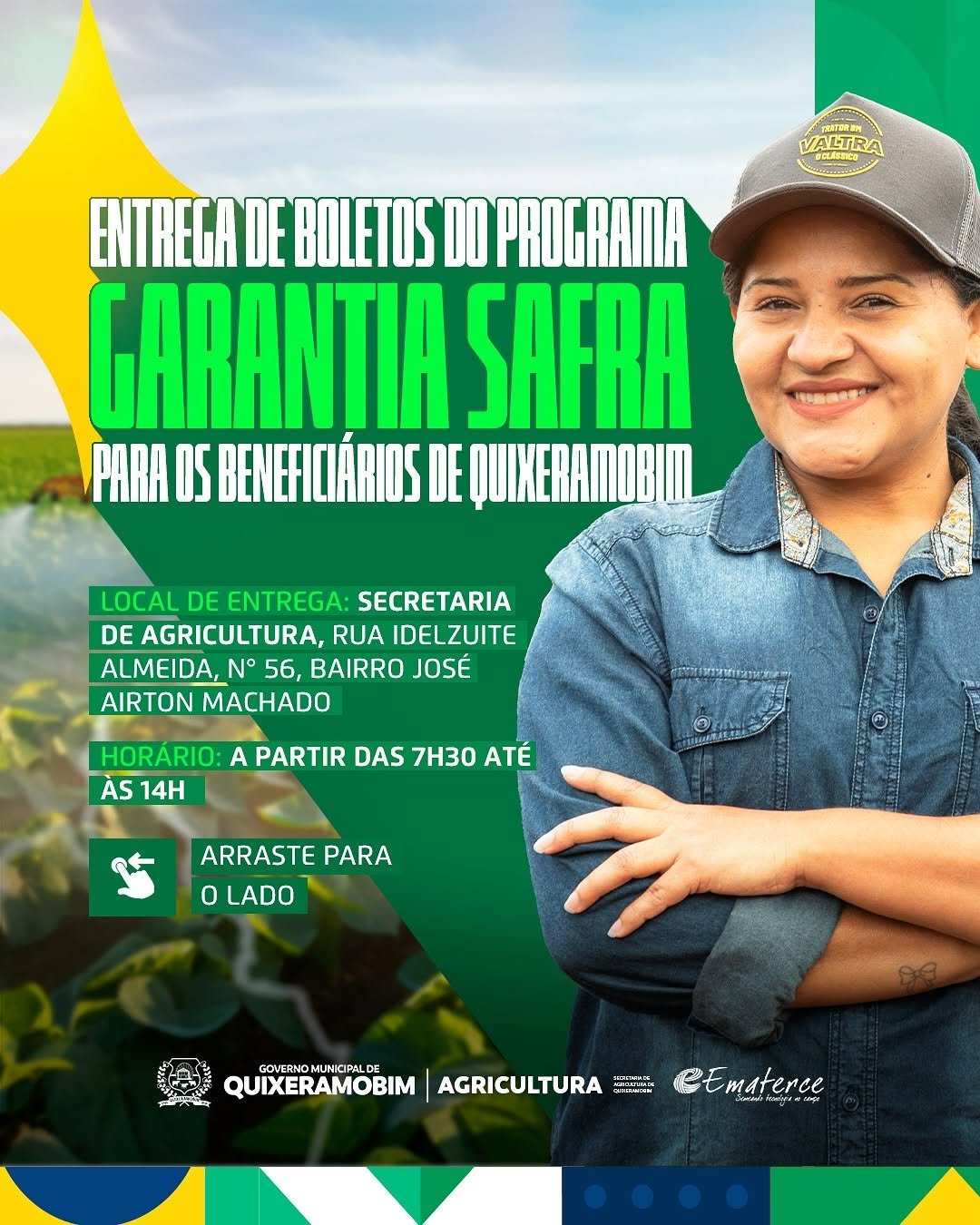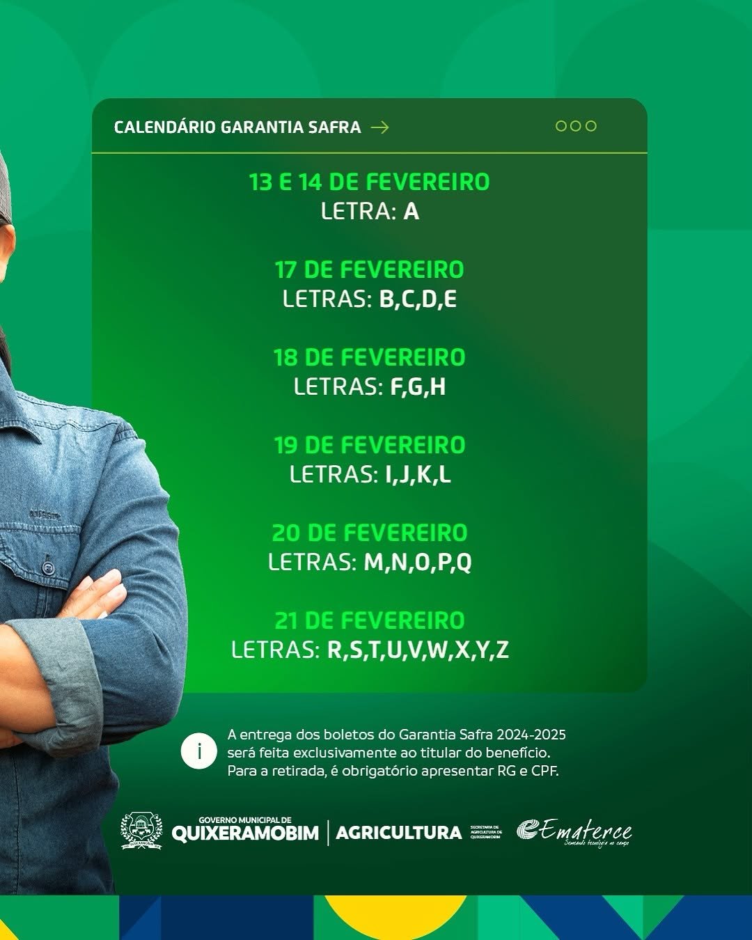 A Secretaria de Agricultura de Quixeramobim, em parceria com a Empresa de Assistência Técnica e Extensão Rural do Ceará (Ematerce), divulgou nesta terça-feira, 11, o calendário de entrega de boletos para o Programa Garantia Safra 2024-2025. A distribuição inicia nesta quinta-feira, 13, e seguirá até o dia 21 de fevereiro.