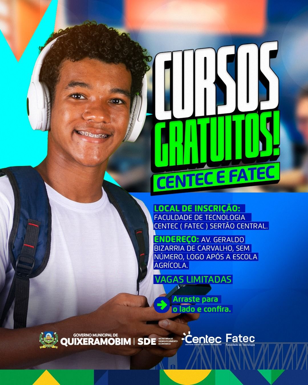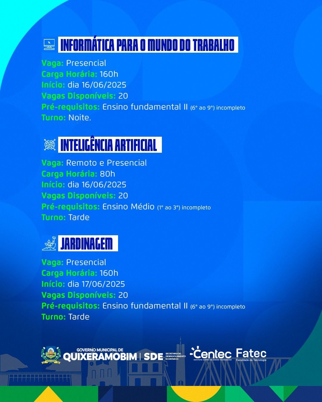 A Prefeitura de Quixeramobim, por meio da Secretaria de Desenvolvimento Econômico (SDE), anunciou a abertura das inscrições para cursos gratuitos oferecidos em parceria com a Fatec/Centec Sertão Central. A iniciativa visa capacitar profissionais e proporcionar novas oportunidades no mercado de trabalho.