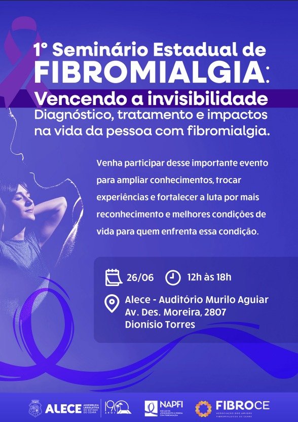 A Assembleia Legislativa do Estado do Ceará sediará, nesta quinta-feira, 26, o I Seminário Estadual de Fibromialgia, um evento dedicado à conscientização e discussão sobre o impacto da doença na vida dos pacientes. O objetivo é discutir políticas públicas, avanços no tratamento, conscientizar, dar visibilidade e reconhecer a fibromialgia como uma doença complexa, que exige uma abordagem multidisciplinar e humanizada.