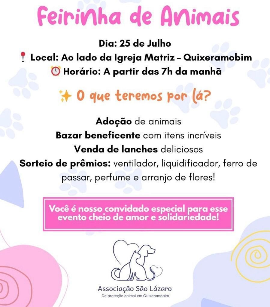 Nesta sexta-feira, 25 de julho, Quixeramobim receberá um gesto de solidariedade e amor pelos animais. A partir das 7h da manhã, ao lado da Igreja Matriz, acontece a tradicional Feirinha de Animais promovida pela Associação São Lázaro de Proteção Animal.