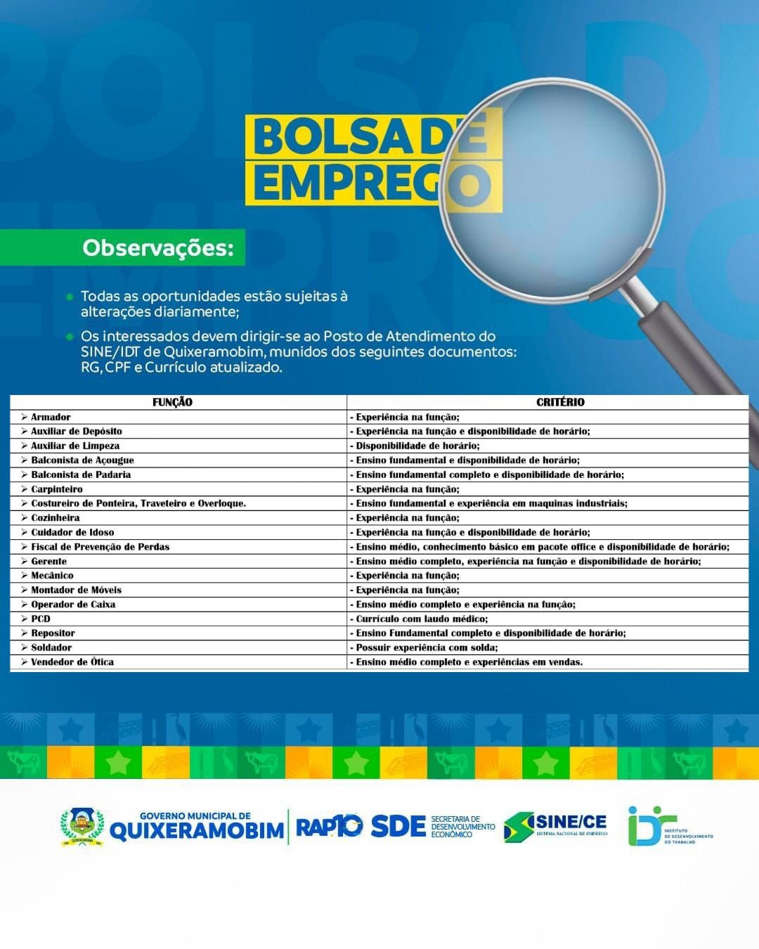 A Prefeitura de Quixeramobim, por meio da unidade local do Sistema Nacional de Emprego (Sine) e da Secretaria de Desenvolvimento Econômico (SDE), divulgou na manhã desta segunda-feira, 08, as vagas de emprego disponíveis no município. Estão abertas oportunidades para diferentes funções, e os interessados devem comparecer ao SINE/IDT local com RG, CPF e currículo atualizado.