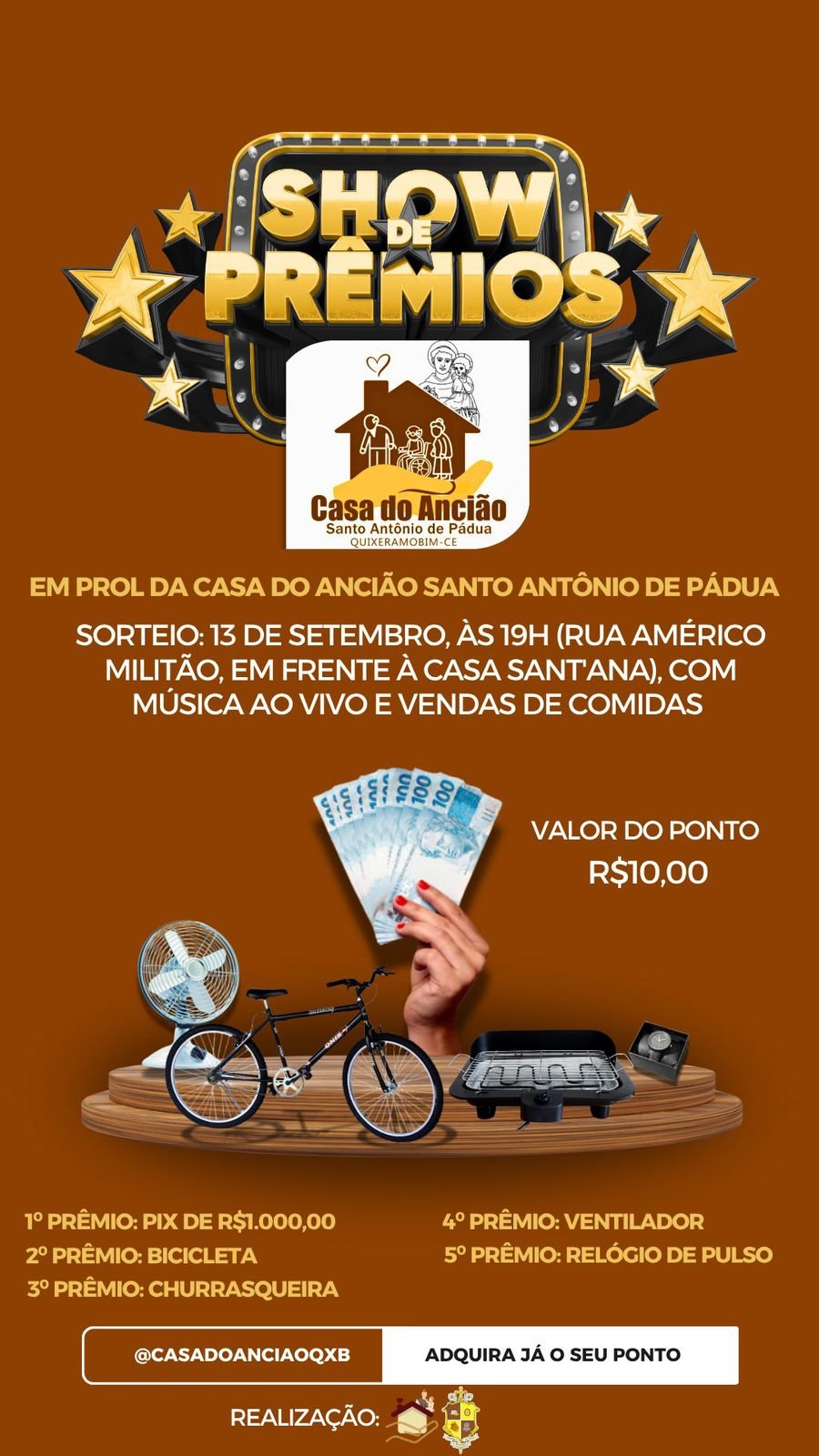 A Casa do Ancião Santo Antônio de Pádua, em Quixeramobim, promove neste sábado, 13 de setembro, a partir das 19h, um Show de Prêmios beneficente com música ao vivo. O evento será realizado na Rua Américo Militão, em frente à Casa Sant’Ana, e tem como objetivo arrecadar fundos para manutenção da instituição, além de incentivar a solidariedade na comunidade.