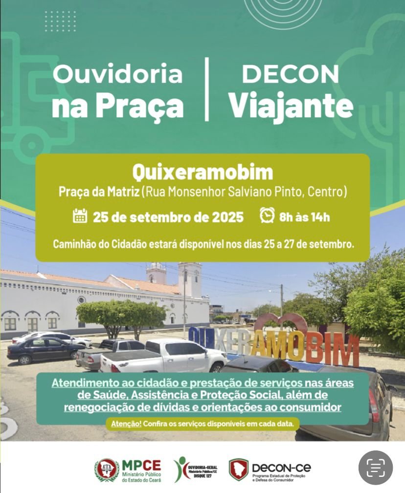 O município de Quixeramobim receberá, entre os dias 25 e 27 de setembro, a iniciativa Ouvidoria na Praça, promovida pelo Programa Estadual de Proteção e Defesa do Consumidor (Decon), vinculado ao Ministério Público do Estado do Ceará. A ação contará com o apoio do Caminhão do Cidadão, que estará estacionado na Praça da Matriz, localizada na Rua Monsenhor Salviano Pinto, no Centro da cidade.