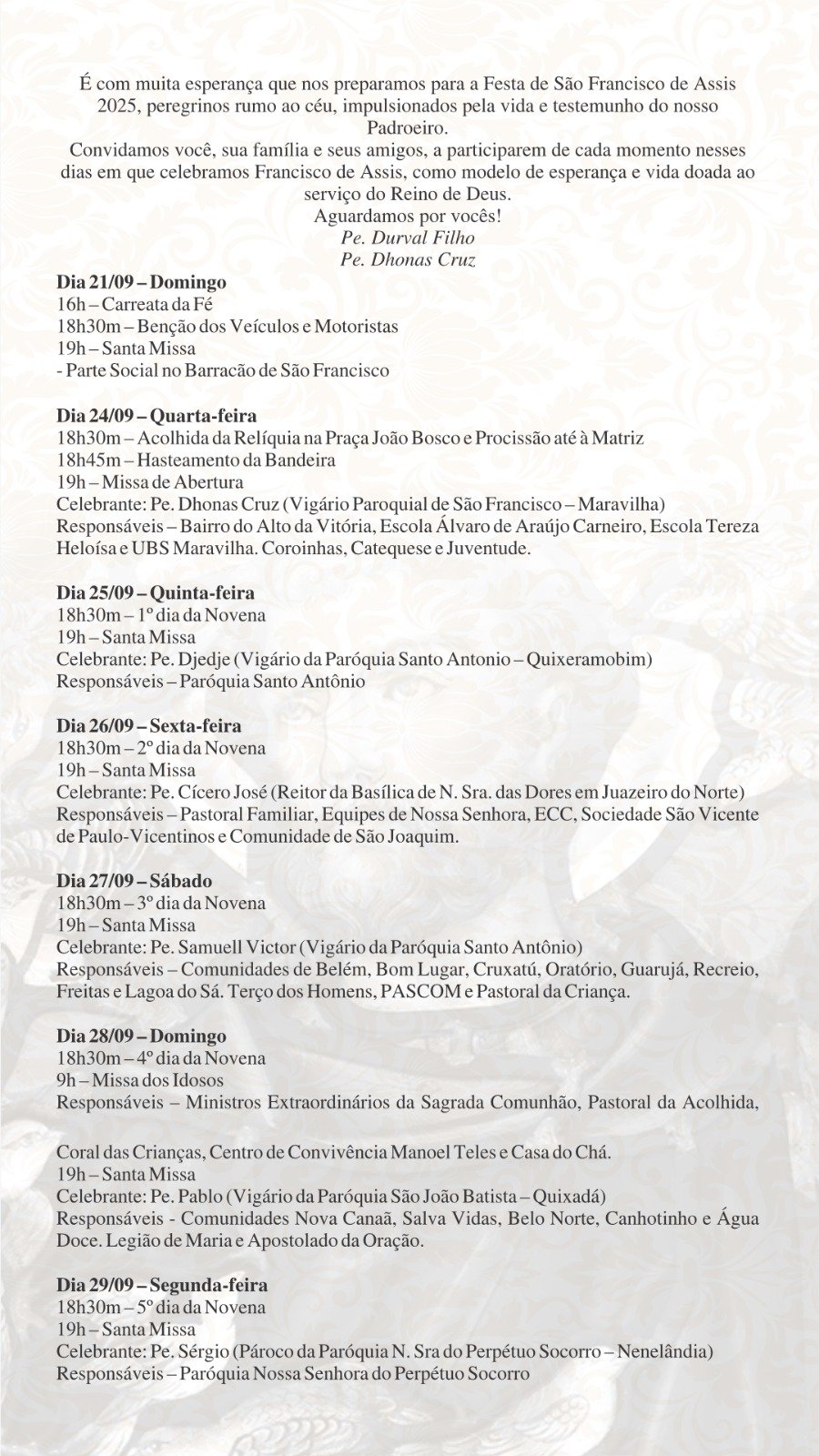 Em nota, a Paróquia convidou a população a participar: “No dia 24 inicia a Festa de São Francisco, um tempo de oração, devoção e alegria em comunidade. Venha participar conosco, traga sua família e fortaleça a fé junto à Paróquia São Francisco.”