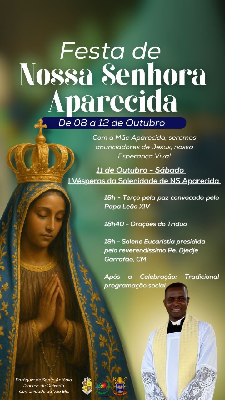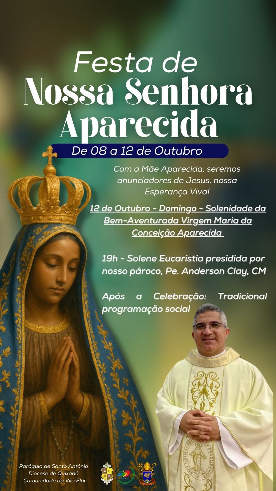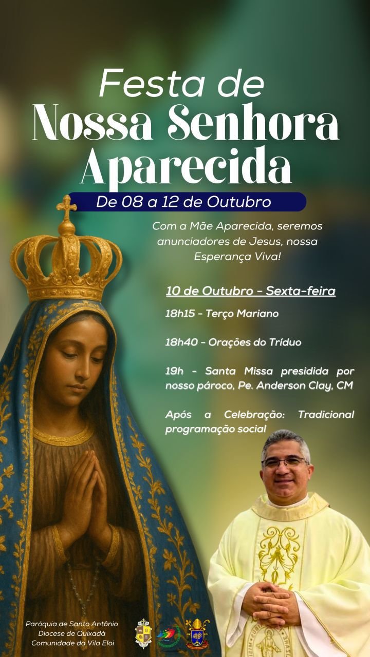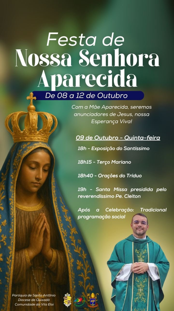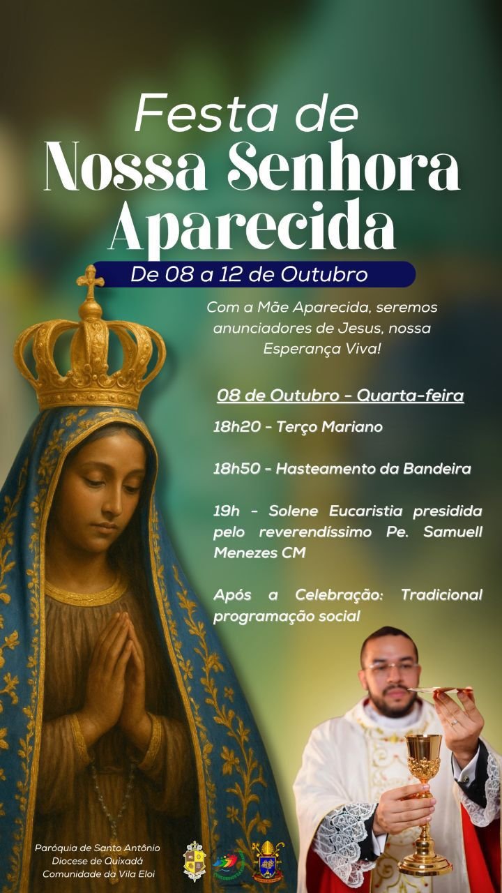 A Comunidade da Vila Eloi, no Bairro Duque de Caxias, pertencente à Paróquia de Santo Antônio, em Quixeramobim, está em festa desde esta quarta-feira, 8 de outubro, com a celebração dedicada a Nossa Senhora Aparecida, padroeira do Brasil. O evento religioso e cultural segue até o próximo domingo, 12, reunindo fiéis e moradores em momentos de oração, devoção e confraternização.