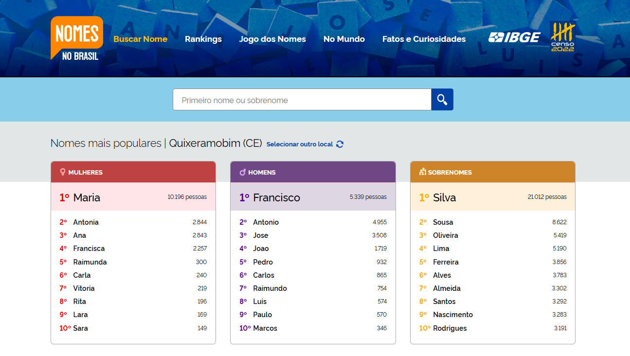 O Instituto Brasileiro de Geografia e Estatística (IBGE) divulgou nesta terça-feira, 4, um levantamento inédito sobre os nomes e sobrenomes mais comuns do Brasil, com dados detalhados por estado e município. Pela primeira vez, o estudo inclui também o ranking dos sobrenomes mais populares, permitindo que os cidadãos consultem a frequência de seus nomes em diferentes localidades, inclusive em Quixeramobim, no Sertão Central.