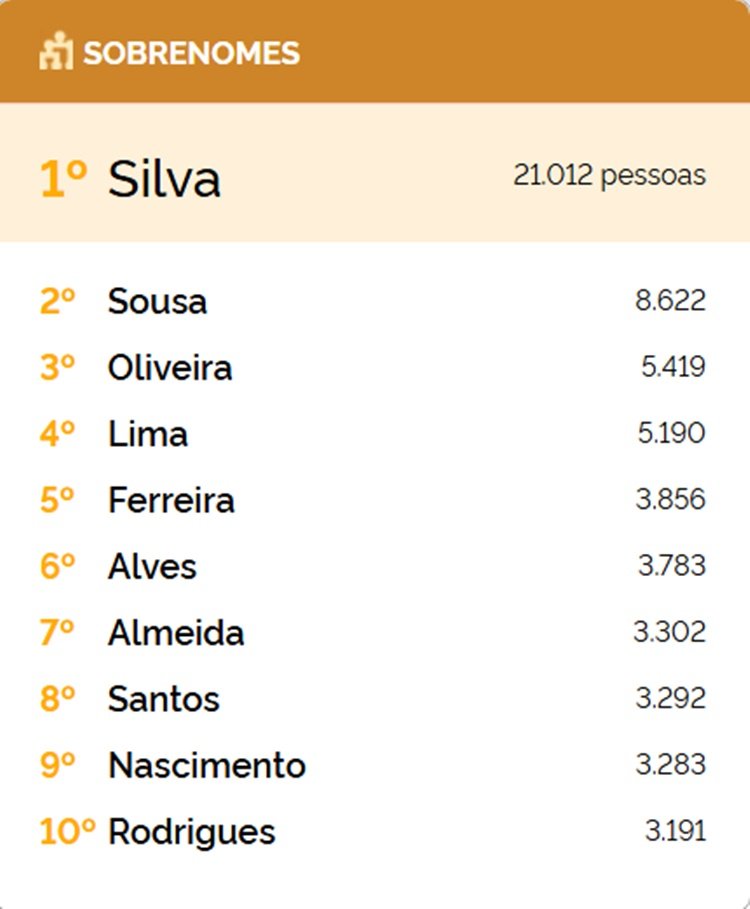 O Instituto Brasileiro de Geografia e Estatística (IBGE) divulgou nesta terça-feira, 4, um levantamento inédito que revela os nomes e sobrenomes mais comuns no Brasil. Pela primeira vez, o estudo apresenta dados detalhados por estado e município, incluindo um ranking dos sobrenomes mais populares em cada localidade.