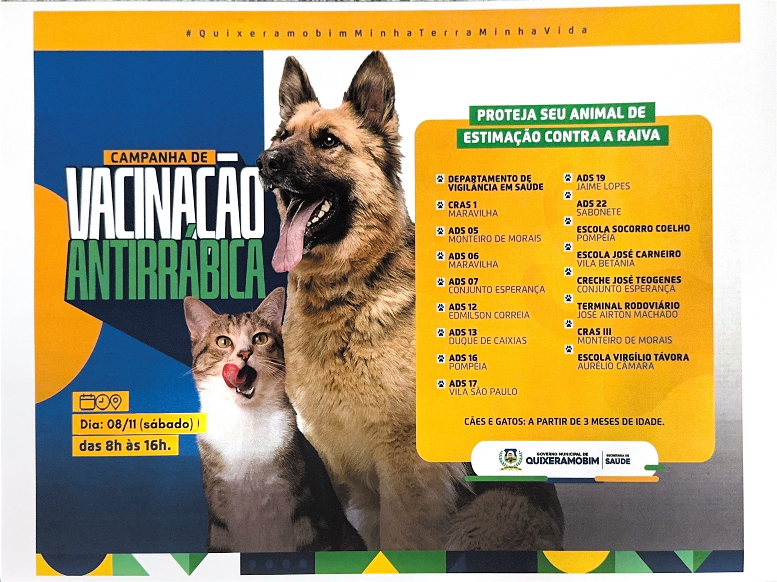 Neste sábado, 8, Quixeramobim realiza Campanha de Vacinação Antirrábica, promovida pela Secretaria Municipal de Saúde. A ação acontecerá das 8h às 16h em diversos bairros, com o objetivo de imunizar cães e gatos a partir de três meses de idade contra a raiva.