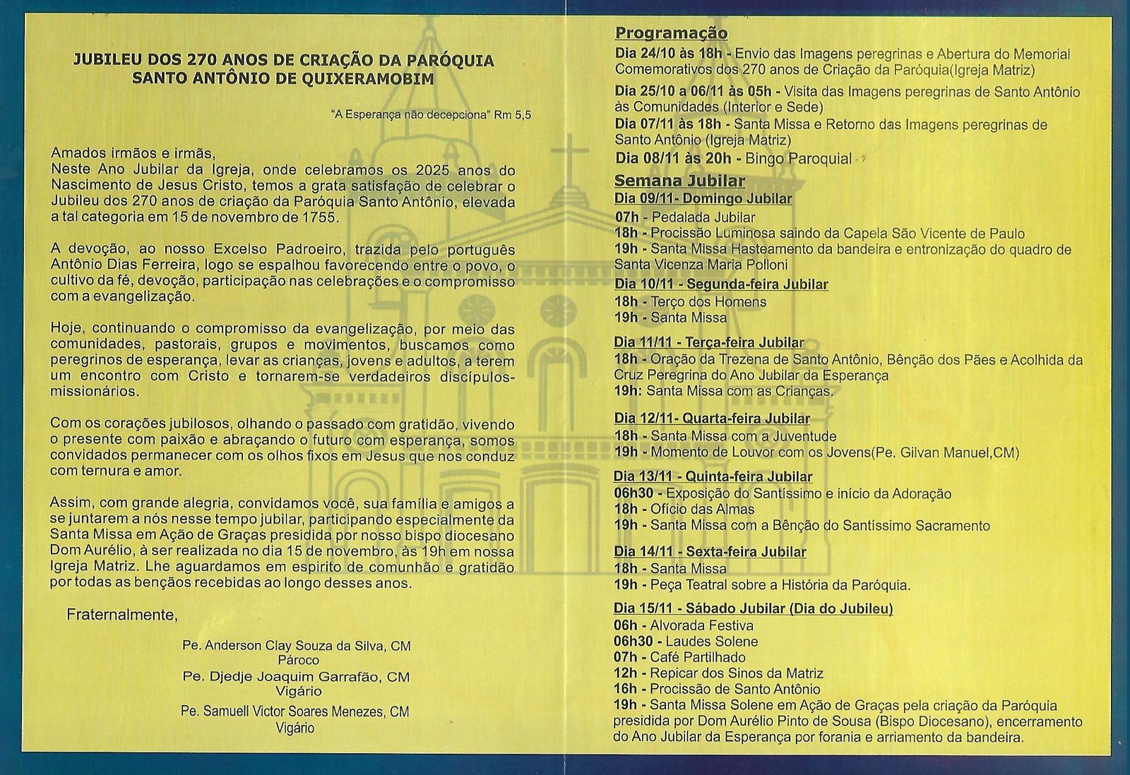 Elevada à categoria em 15 de novembro de 1755, a Paróquia de Santo Antônio de Quixeramobim celebra o Jubileu dos seus 270 anos de criação com uma extensa programação, iniciada no dia 24 de outubro com o envio das imagens peregrinas e a abertura do Memorial Comemorativo.
