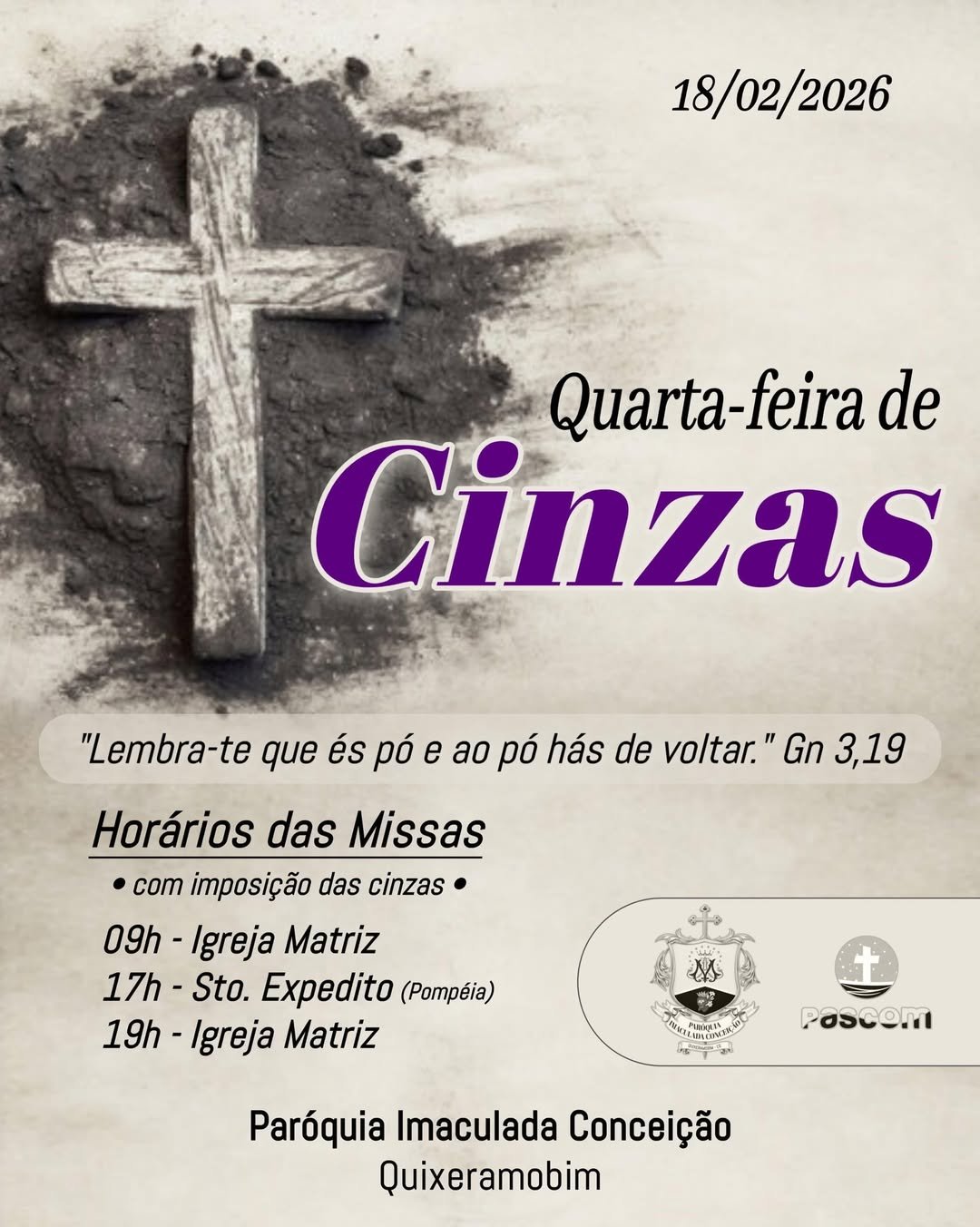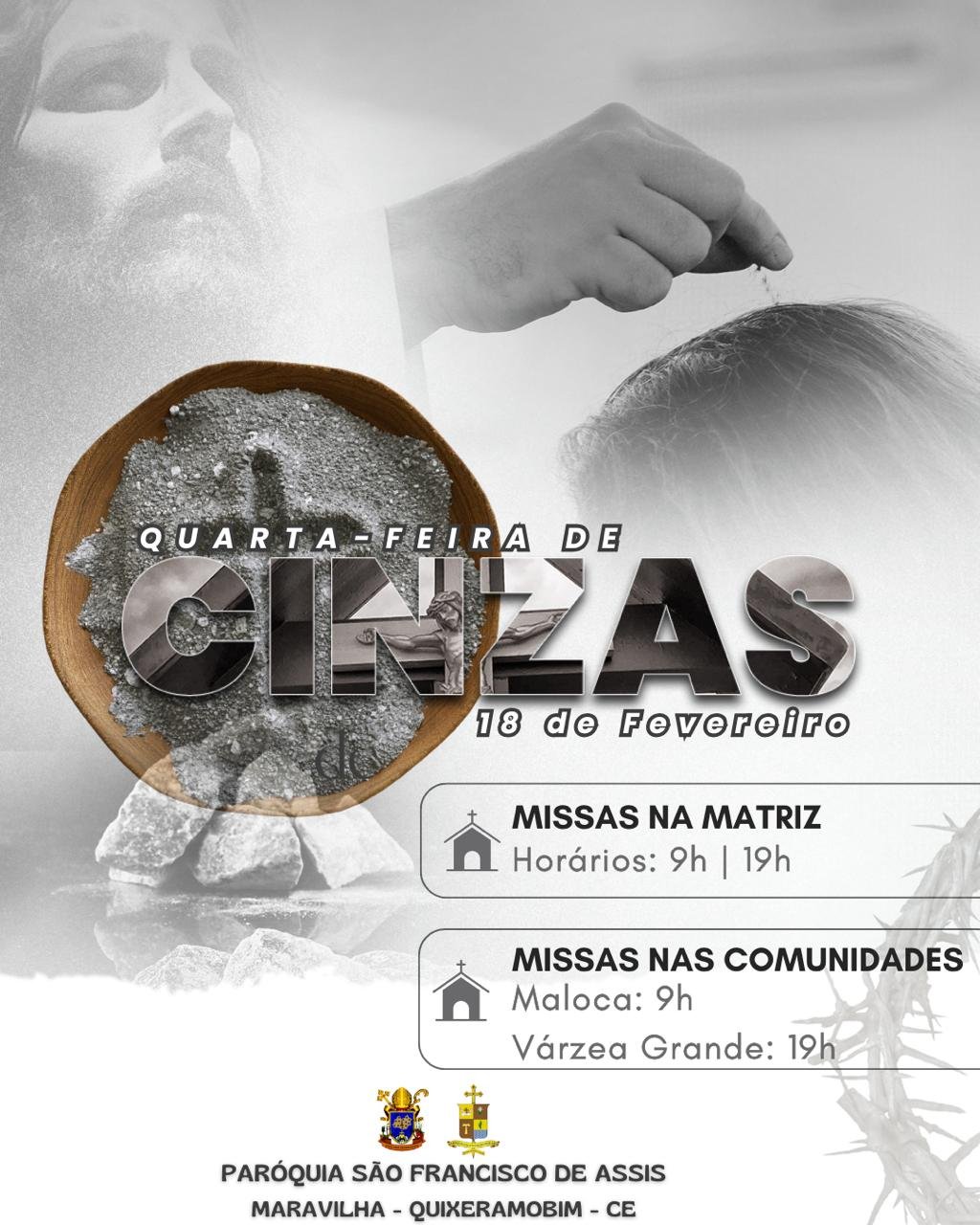 Nesta Quarta-feira de Cinzas, 18, dia que marca o início da Quaresma, as Paróquias de Santo Antônio, Imaculada Conceição, São Miguel Arcanjo e São Francisco da Maravilha, em Quixeramobim, celebram missas especiais para os fiéis. Este é um momento de reflexão, oração e preparação espiritual para a Páscoa.