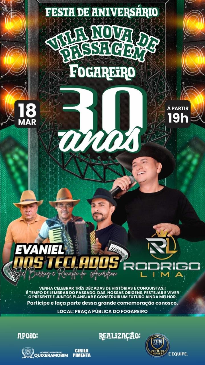 A comunidade de Vila Nova de Passagem, o Fogareiro, no distrito de Passagem, zona rural de Quixeramobim, celebrará seus 30 anos de fundação na próxima quarta-feira, dia 18, às 19h, na Praça Pública da localidade.