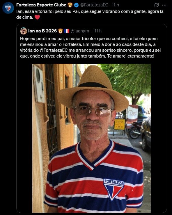 “Hoje eu perdi meu pai, o maior tricolor que eu conheci, e foi ele quem me ensinou a amar o Fortaleza. Em meio à dor e ao caos deste dia, a vitória do @FortalezaEC me arrancou um sorriso sincero, porque eu sei que, onde estiver, ele vibrou junto também. Te amarei eternamente!”